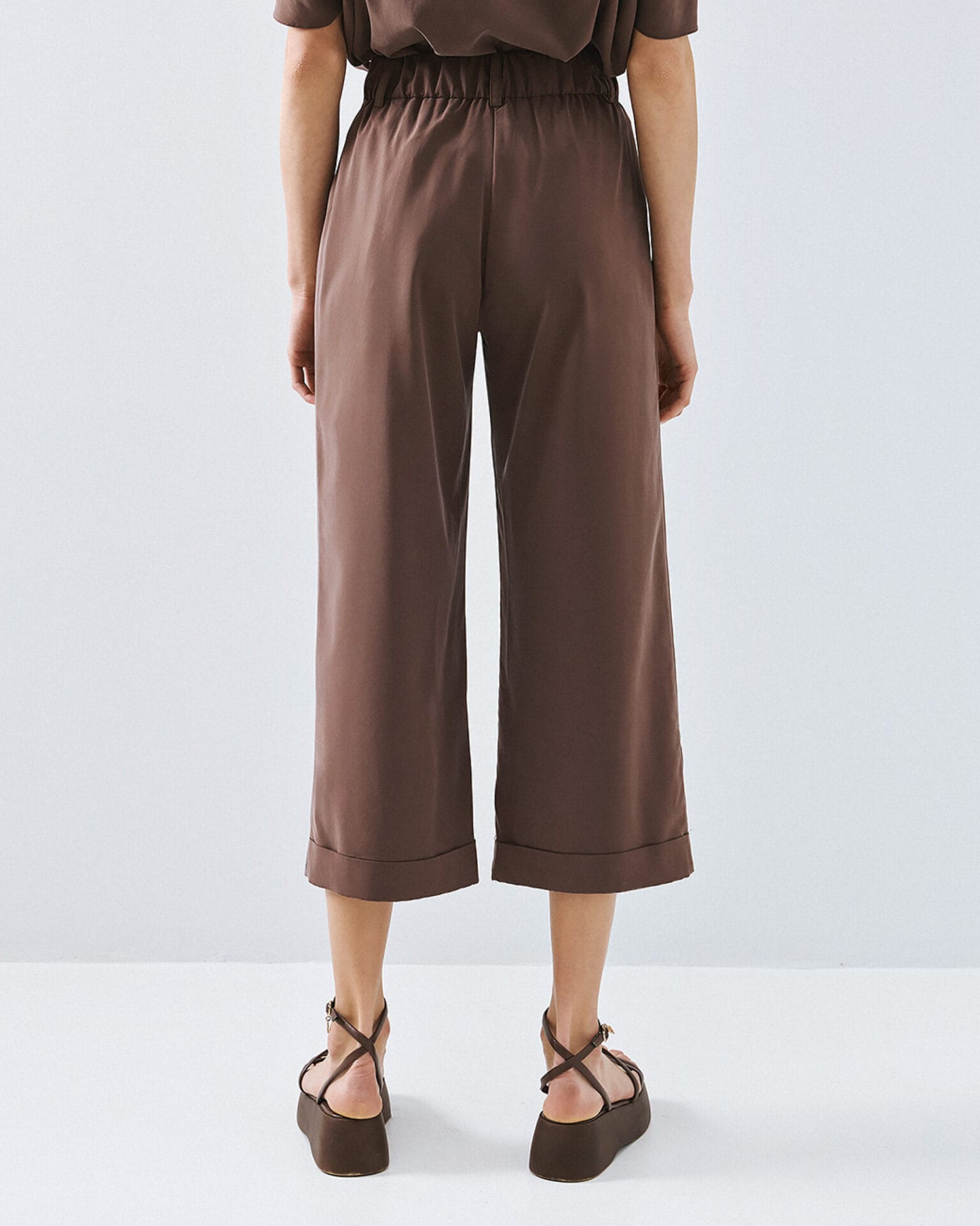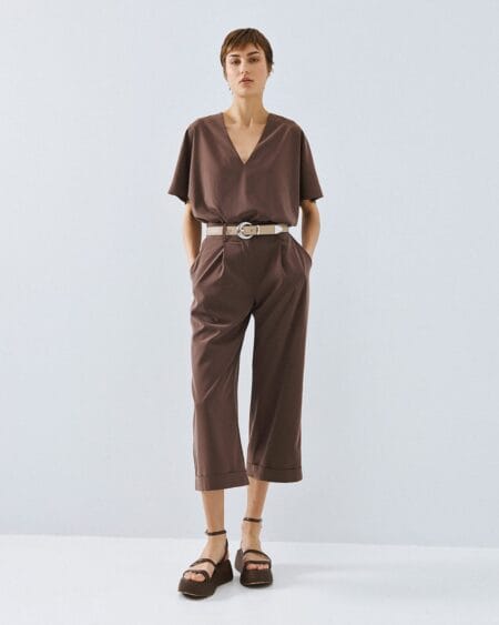 Access fashion 7/8 broek choco , elegante broek met los vallende pijp en elastiek in de taille. Combineer met de bijpassende top met v-hals voor een mooie basis zet. Basic chique.