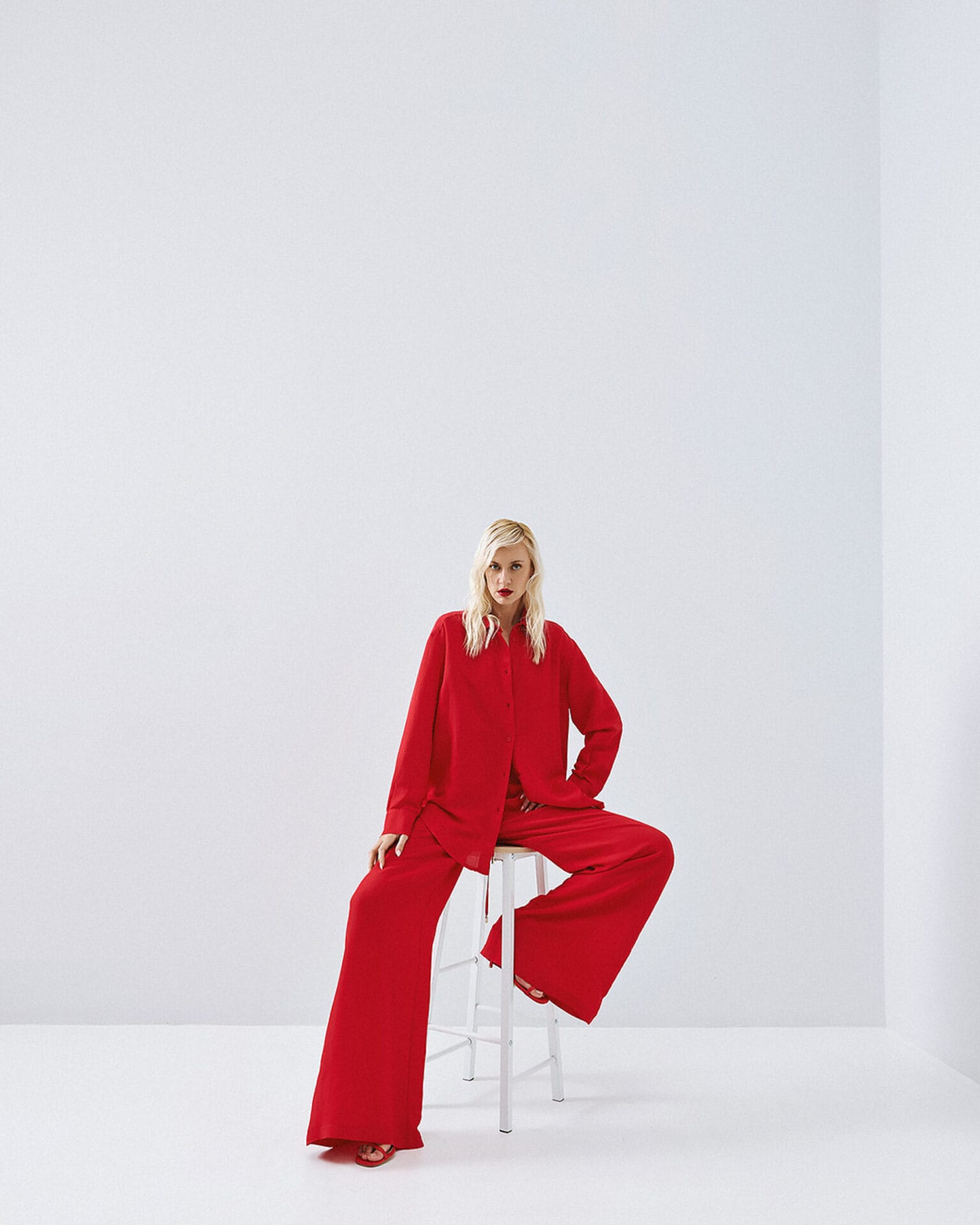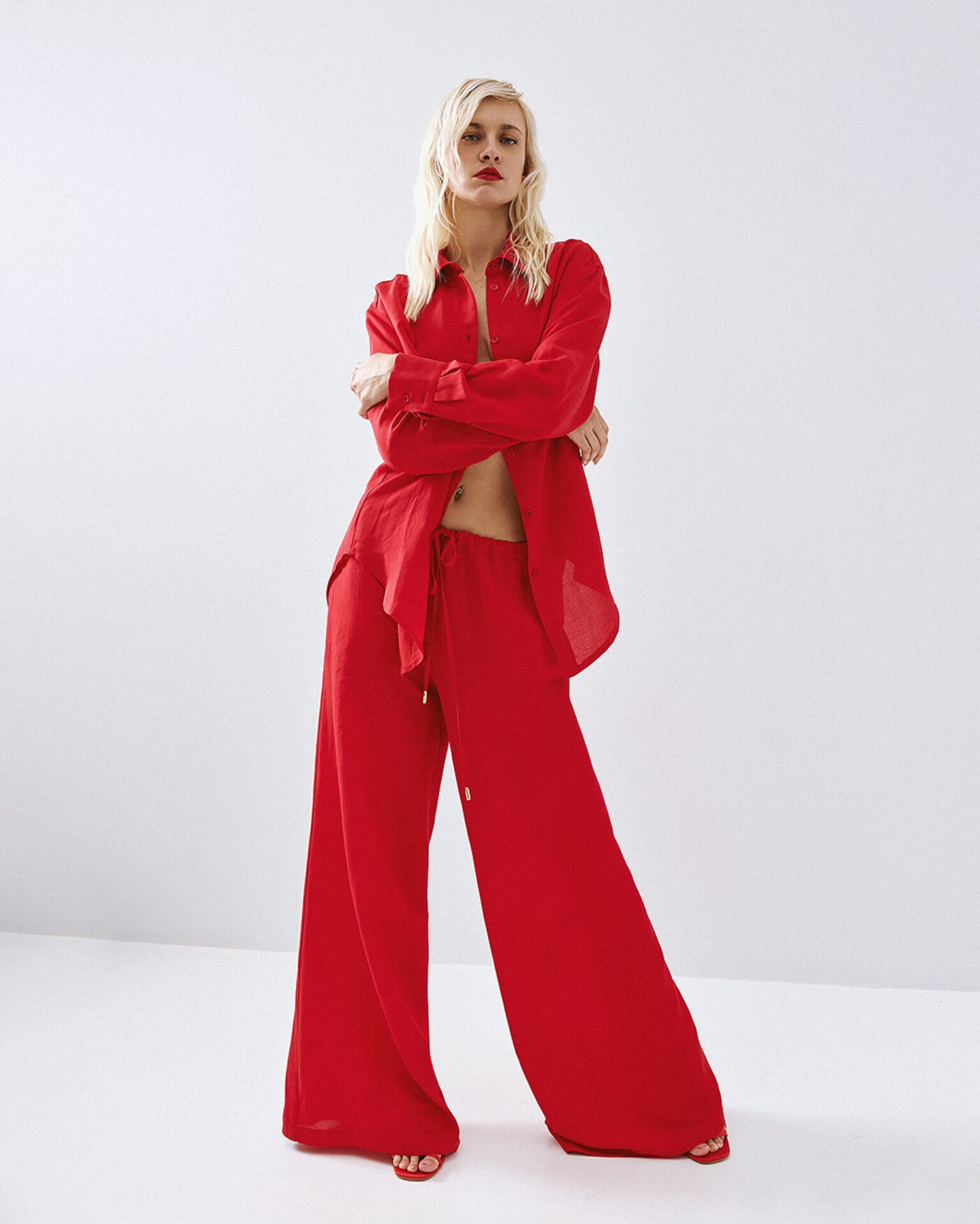 Access fashion linnen blouse red lipstick , los vallende blouse welke een mooie combinatie maakt met de bijpassende wijde broek, in dezelfde kleur.