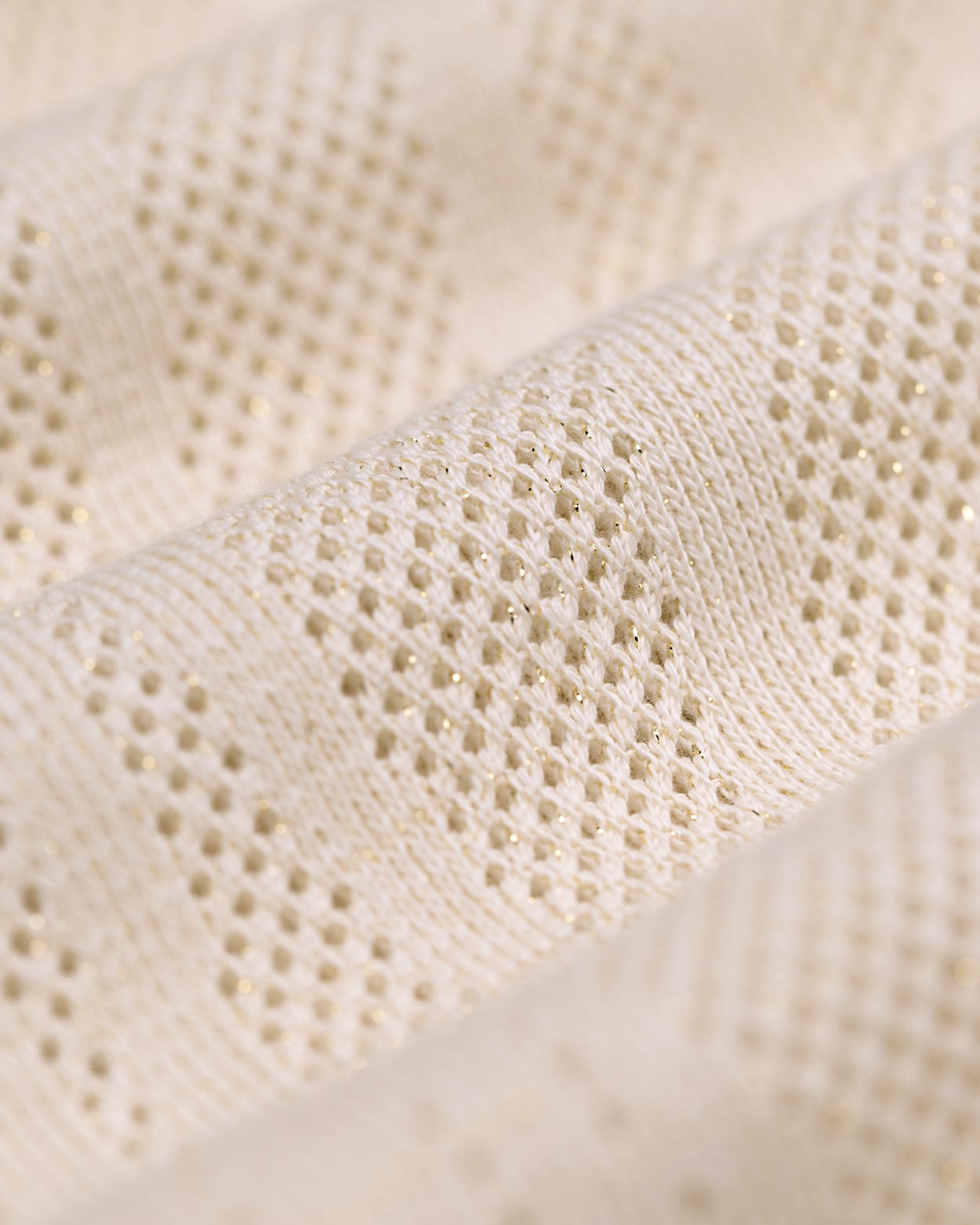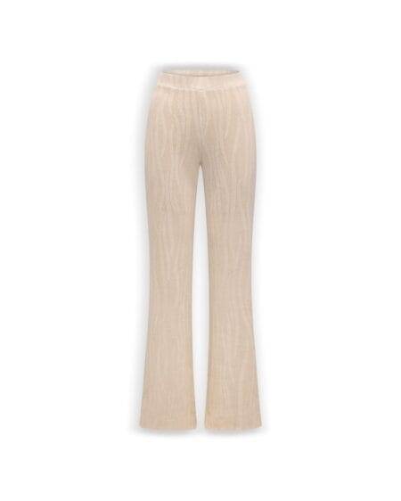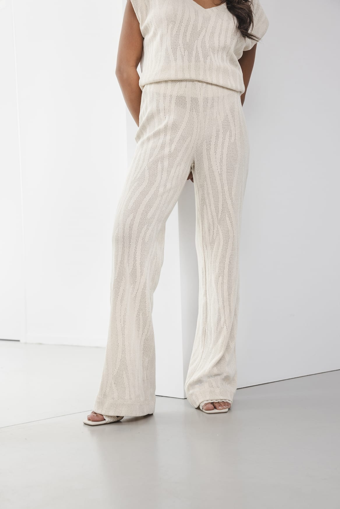 Deze elegante broek is gemaakt van een luchtige, opengewerkte stof met een subtiel golvende structuur. De kleine gaatjes in de stof geven een speels, verfijnd effect, terwijl de gouden glans zorgt voor een chique uitstraling die prachtig meebeweegt in het licht. Dankzij het binnenbroekje van tricot in de broek schijnt de broek niet door en blijft het geheel comfortabel en zelfverzekerd om te dragen.