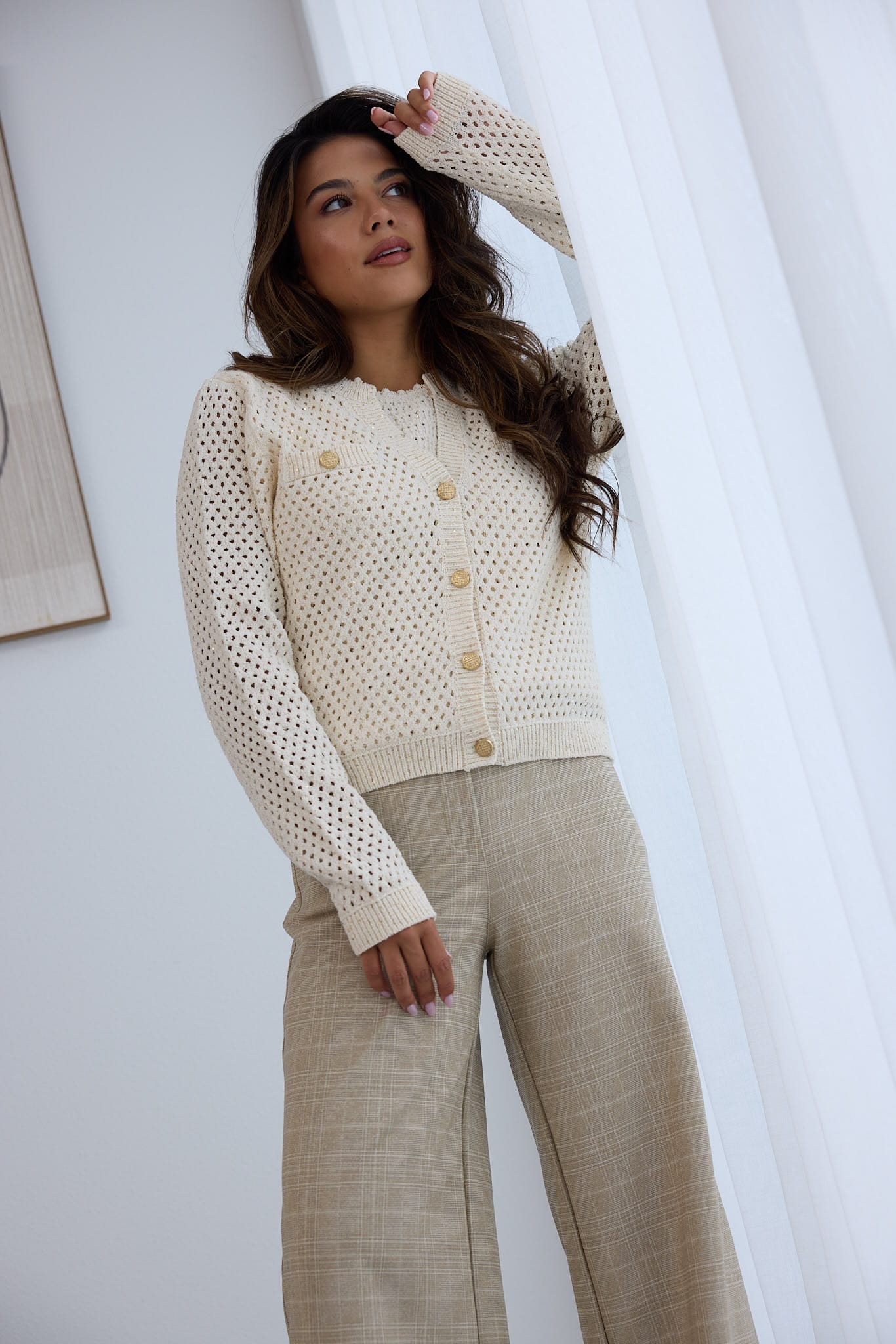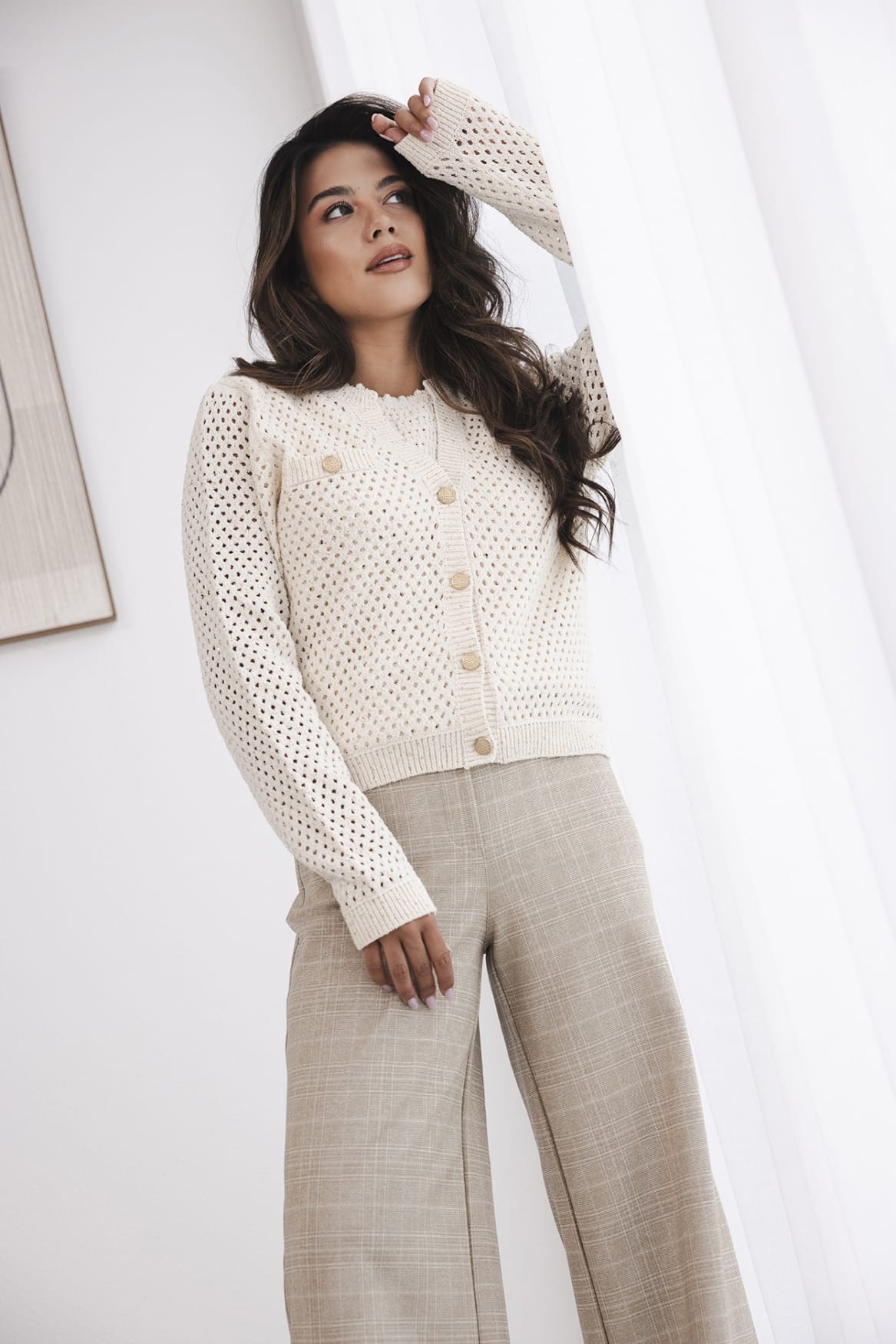Een verfijnd vestje waarmee je elke outfit moeiteloos afstyled. Dit ecru vest is opengewerkt gebreid, waardoor het een luchtige, elegante structuur krijgt die perfect is voor zowel casual als chique looks.