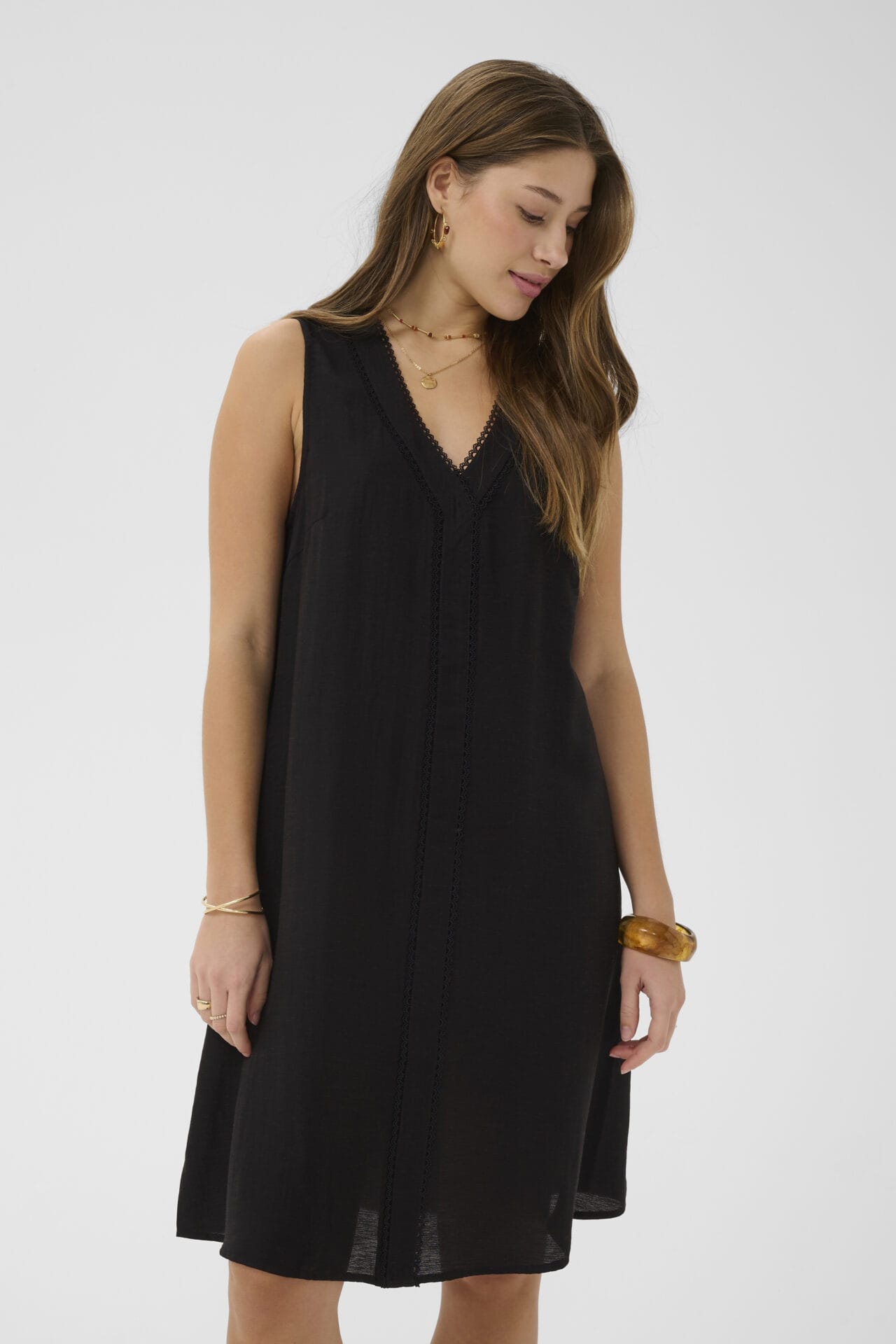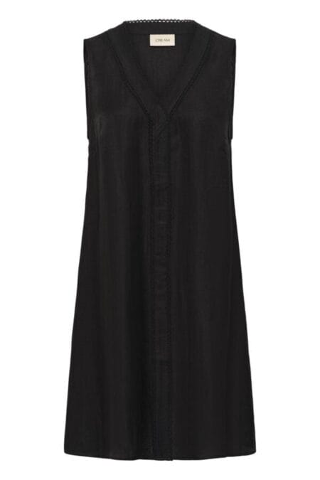Cream jurk Cecillia zwart, jurk met v-hals en schulp afwerking aan de halsrand.