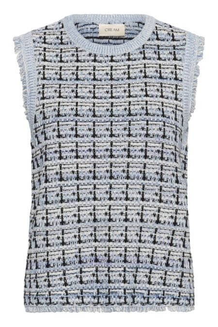 Cream top over blauw , top geweven in blauwe tinten en gemaakt van 80% katoen 15%polyester ,5% metallic.
