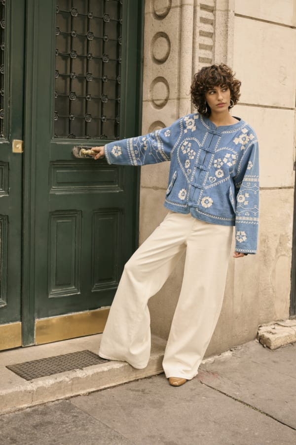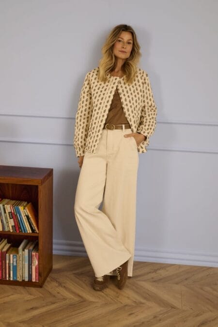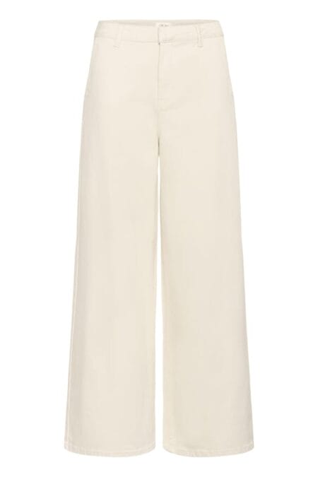 Cream visti twill broek natural sand , broek met wijde uitlopende pijp.