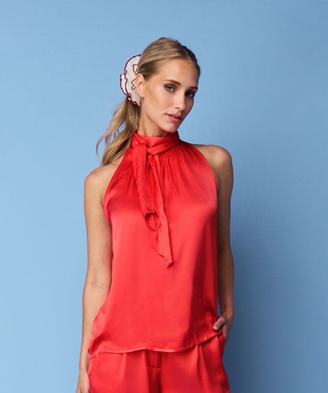 De Tolino top in de kleur Rosa Coral. De top heeft een halternek met trikkoord en is gemaakt van soepele Rayon en Viscose. Combineer de top met de bijpassense Pasha broek voor een zomerse co-ord look.