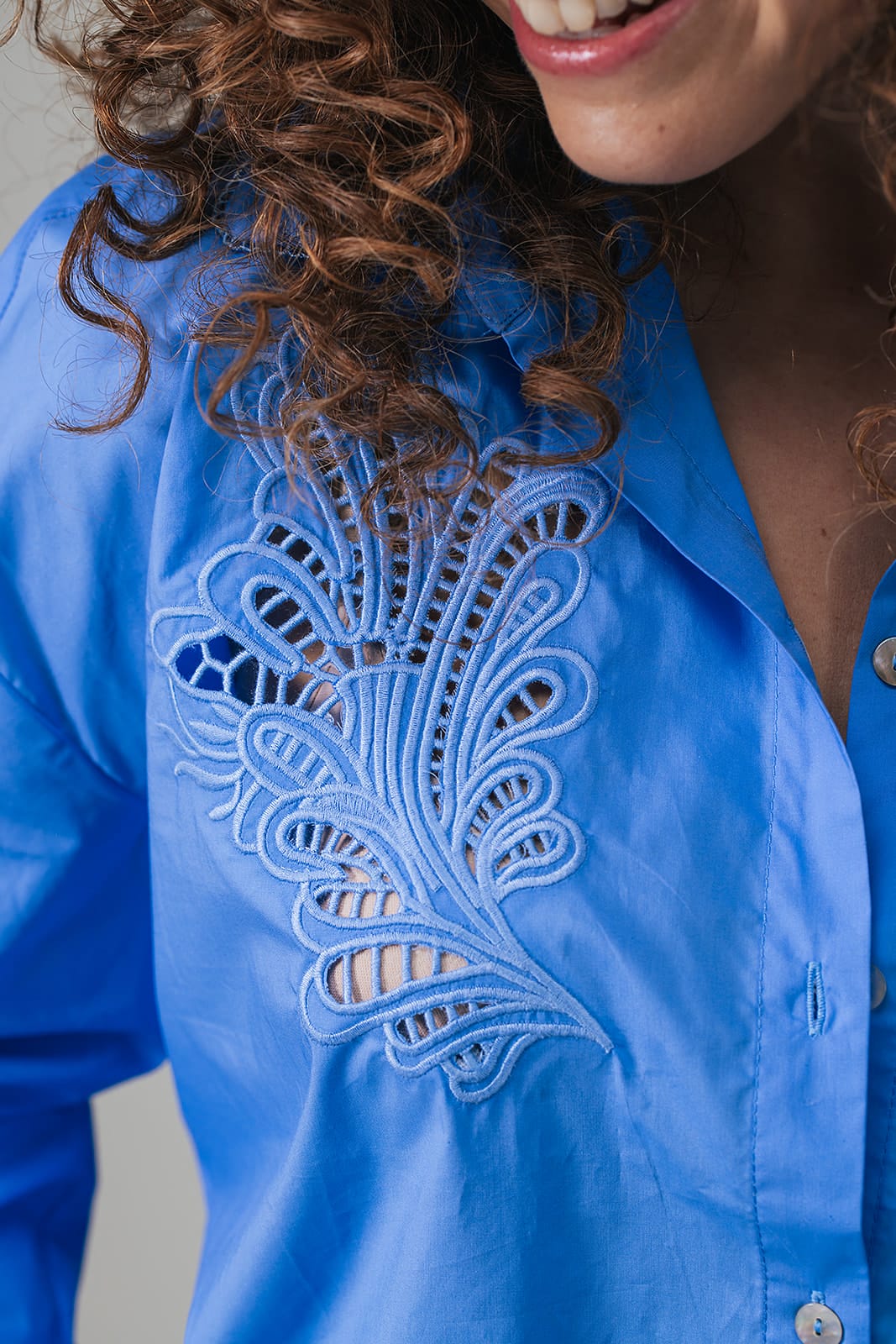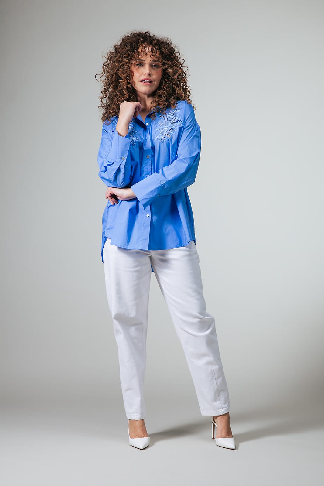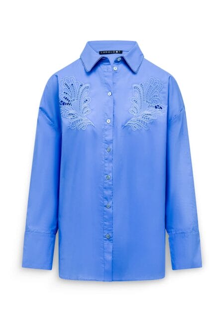 Zacht, vrouwelijk en vol verfijnde details. Blouse Adola is verrijkt met broderie anglaise aan de voorkant en verkrijgbaar in twee kleuren: klassiek wit en korenbloemblauw. Het lange, wijde model oogt nonchalant door de verlaagde schoudernaden en brede boorden die je speels kunt omslaan. Het kraagje met kant en parelmoerknoopjes maken het ontwerp compleet. Draag Adola solo of combineer met gilet Lotte voor een gelaagde look.