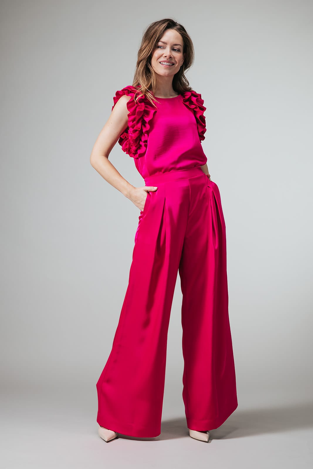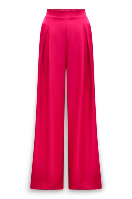 Deze wijde bandplooipantalon valt heerlijk soepel en zwierig, perfect voor een chique maar comfortabele look. De bandplooien geven structuur en de tailleband heeft aan de achterkant een elastische inzet. Daardoor oogt de broek niet alleen elegant, maar zit hij ook heerlijk. Style ‘m met top Molly voor een complete look van top tot teen of als combi met blouse Amin voor extra glans en glamour. Verkrijgbaar in goud en fuchsia.