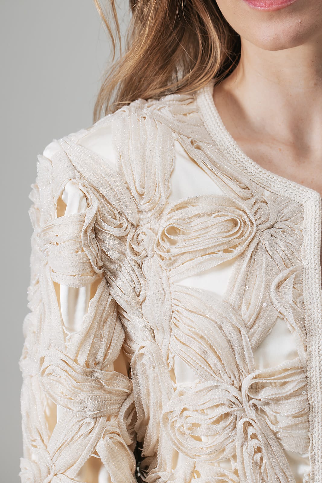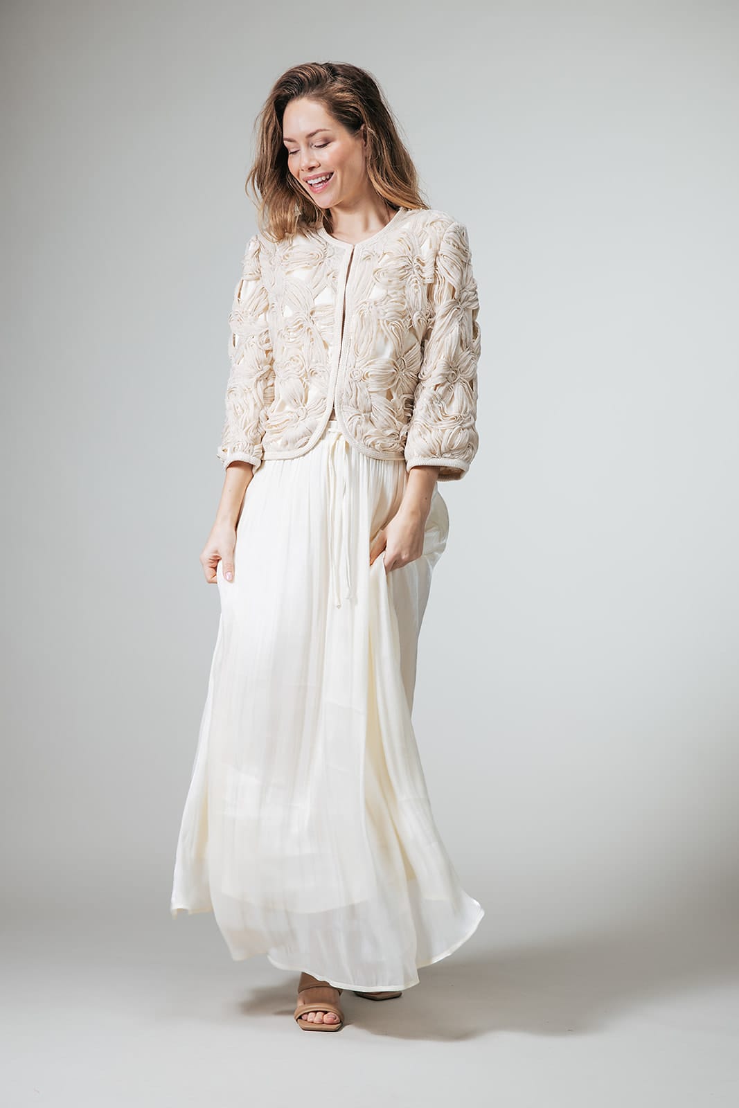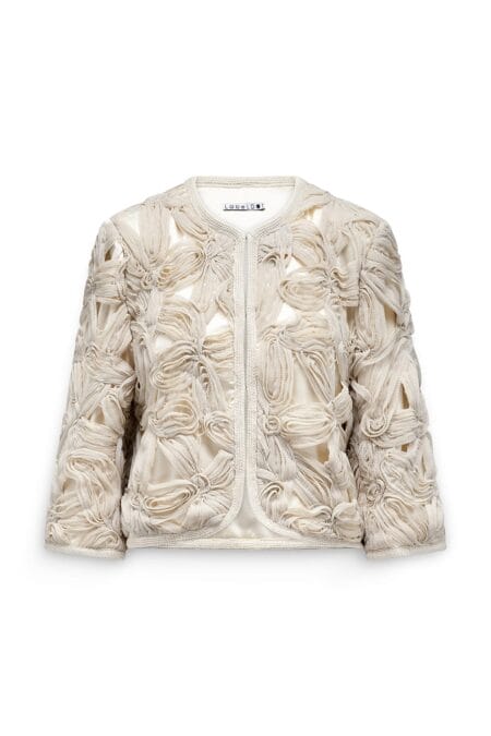 Het lijkt wel een couturestuk! Jasje Lisa is een ware blikvanger uit onze zomercollectie, vervaardigd van een luxe glanzende stof met 3D-bloemen, die extra diepte krijgen door de satijnen voering erachter. De rond afgewerkte randen en gebreide biezen zorgen voor een verfijnde finish. Het jasje sluit onzichtbaar met haakjes en oogjes. Draag ‘m boven pantalon Remilia of maxi-rok Emi voor een uitgesproken, chique look.