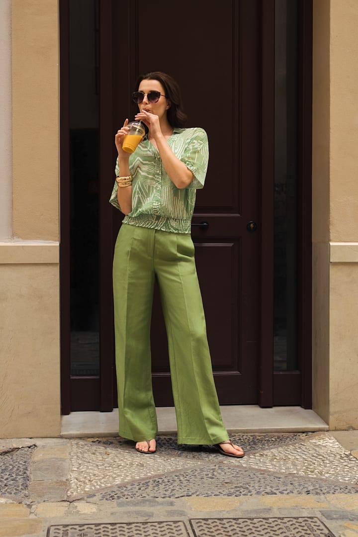 Kledingstukken met mooie details zijn het handelsmerk van LabeL DOT. Deze wijde pantalon in luxe glanzende stofkwaliteit heeft bandplooien en een persvouw voor een elegante look. Verder heeft het model twee steekzakken, een brede tailleband met riemlussen en een paspelzak rechtsachter. Draag ‘m met blazer Lot voor een sophisticated zomerpak of style de broek met een basic top voor een relaxtere vibe.