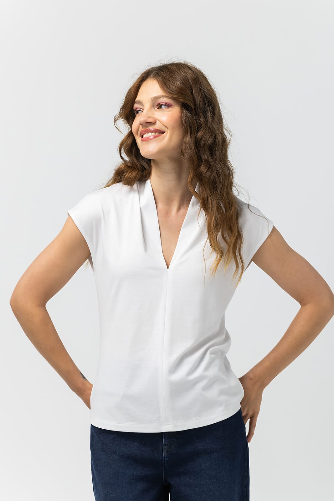 Op zoek naar een basic shirt dat net even wat rijker is uitgewerkt? Deze top met kapmouwtjes en vrouwelijke V-hals combineert eenvoud met finesse. Gemaakt van een comfortabele stof en met een verfijnde belijning, is dit item perfect als basis voor talloze stijlvolle looks.