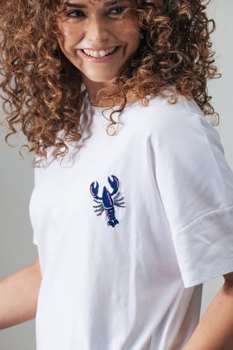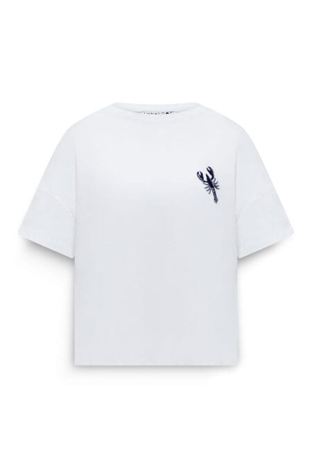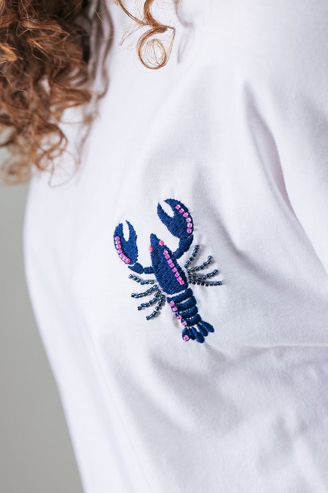 Label Dot tshirt mara wit , wit basis luxe tshirt met leuke lobster applicatie in het blauw.