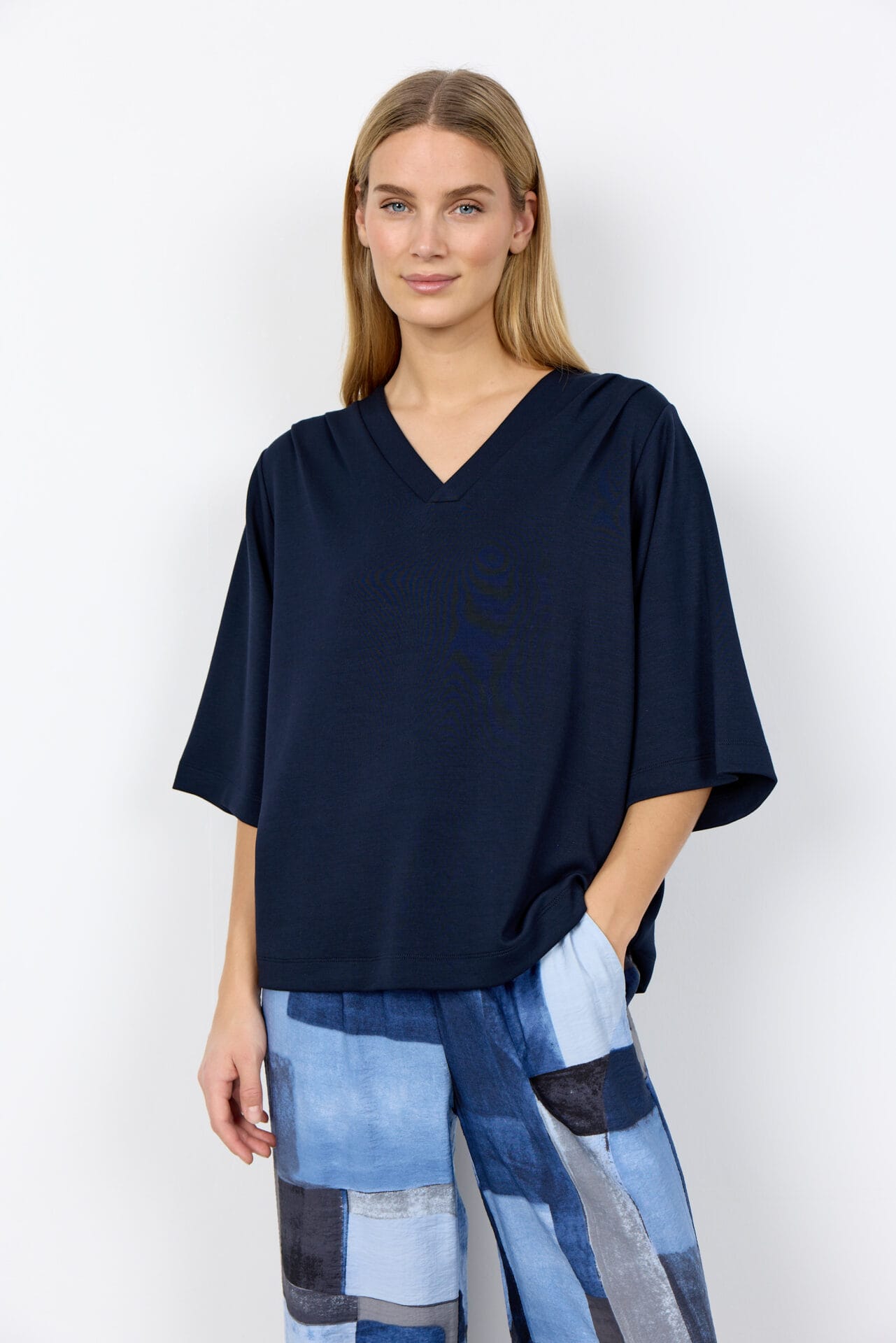 Soyaconcept banu top donker blauw , top heeft een v-hals en een driekwart mouw.
