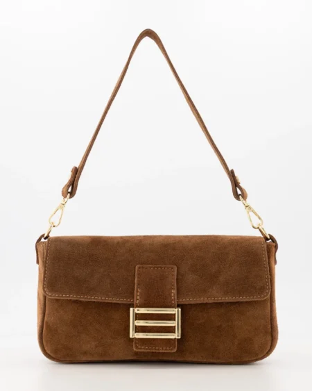 Suede hand schoudertas livio cognac , chique look tas met goudkleurige gesp.